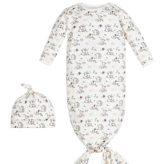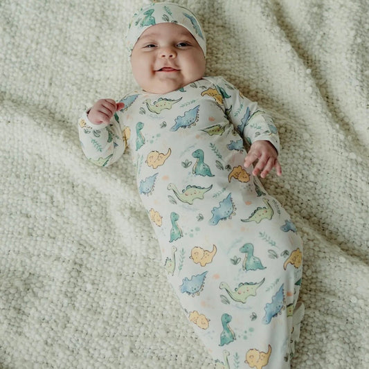 Organic Baby Dinosaur Knotted Gown and Beanie Set