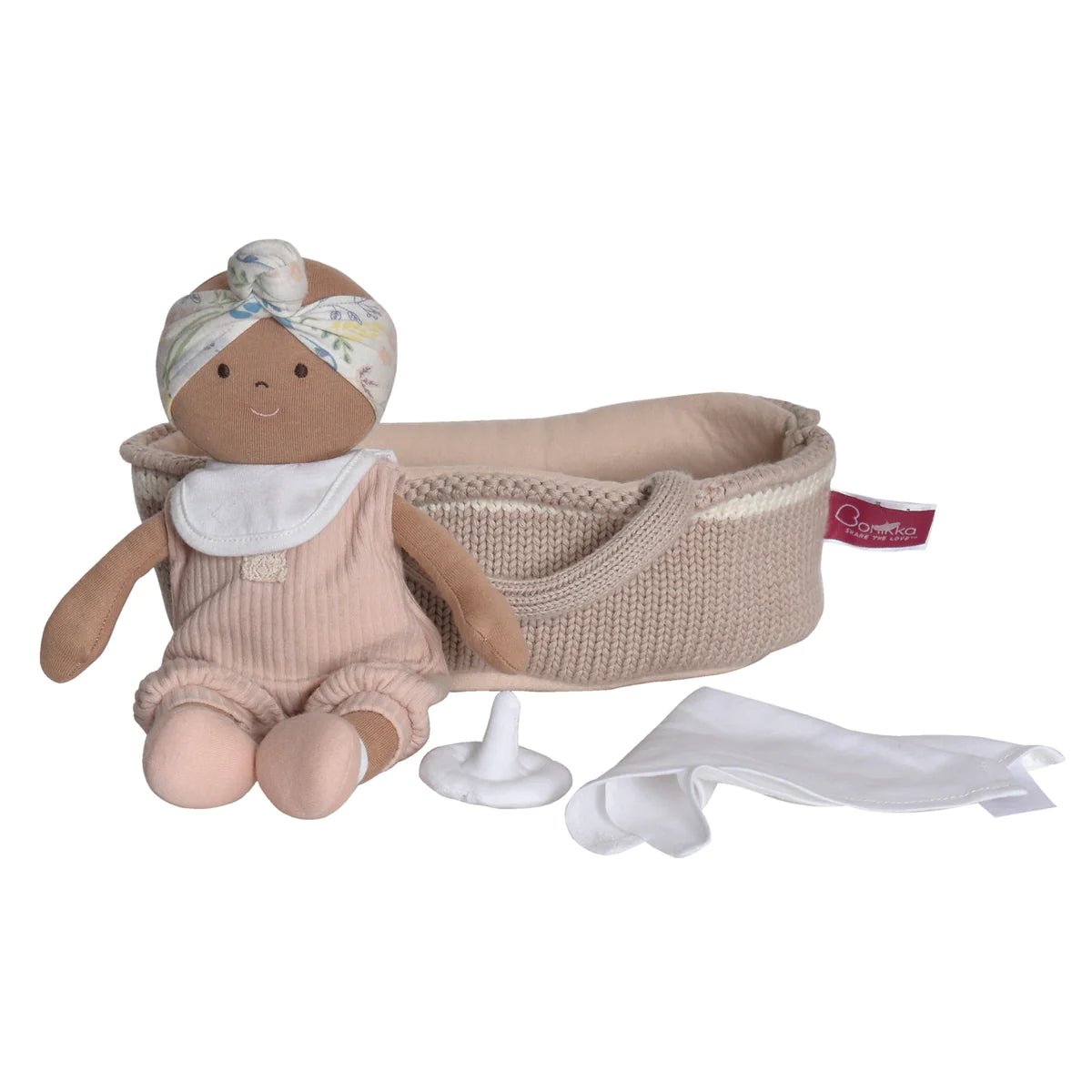 Our beautiful fabric baby doll comes with a knitted carry cot, blanket, cute bandana, soother, and bib. Designed to help little ones self soothe, these dolls are wonderful and safe choices for babies and toddlers. Older kids will love the experience of looking after the baby which also helps develop empathy and social skills. These soft and cuddly dolls are a darling choice for little ones.