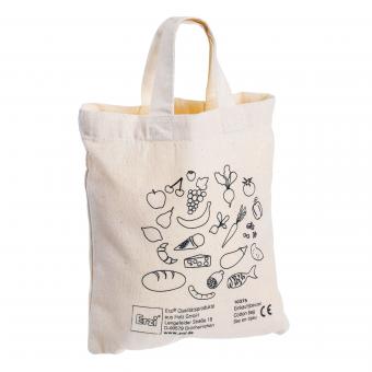 A market tote bag for kids to play or use just like the adults in their lives. This eco-friendly, 100% cotton bag is printed with simple images of fruits, vegetable, breads, meats and other grocery goods.