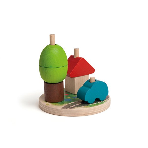With this educational and developmental stacking toy, children assemble a tree, a house, and a car. The pegs differ in size as a guide for stacking, but of course toddlers can have fun stacking the shapes in various ways. The wooden pieces can also be used as threading toys, pretend play, or drawing templates.