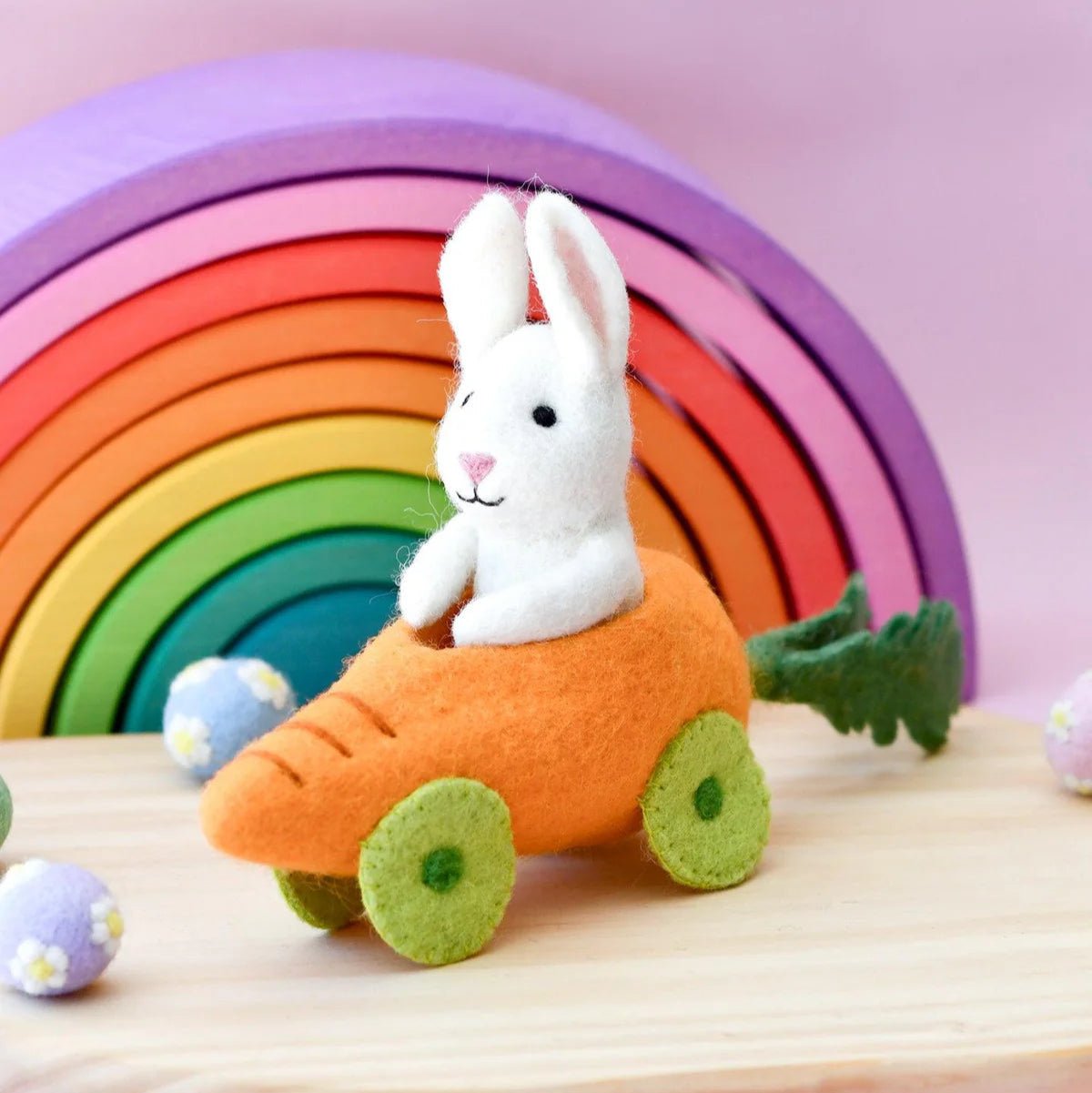 Get ready for a whimsical journey with our adorable Felt Bunny Rabbit and its carrot-powered car! Whether it's a make-believe race through enchanted forests or a gentle drive to the land of imagination, the Felt Rabbit is there to bring joy and comfort.