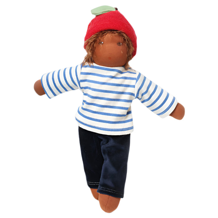 Levi the Garden Child doll is handmade of organic cotton and stuffed with new organic wool. The Waldorf style hand painted neutral facial expression leaves room for a child's emotional and imaginative world. Levi is soft with a nice weight for soothing cuddles. He has brown hair and dark skin and wears an apple cap over mohair hair. Clothing is removable.