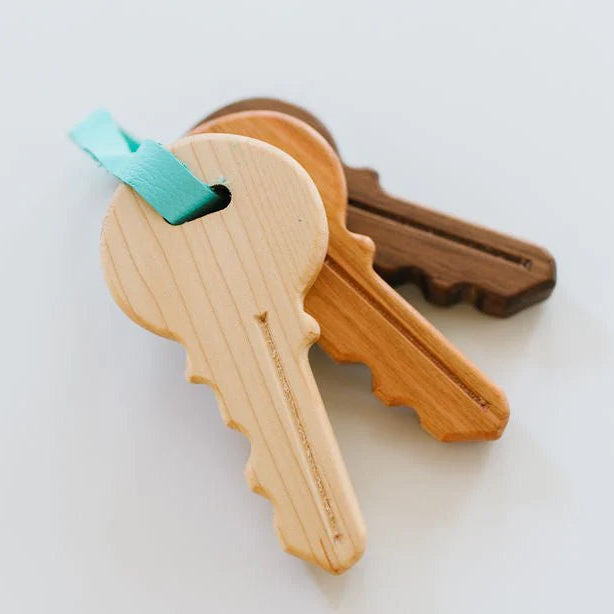 This classic toy is hand crafted of natural maple, cherry, and walnut wood to give each key its own color. The groove down one side adds a realistic touch. Sanded smooth and finished with organic beeswax and flaxseed oil, these keys are safe for teething babies. The natural woodgrain makes each toy unique, and the feel and scent of the wood brings nature into sensory exploration. The keys are permanently strung together on a leather strap with just enough room to turn the keys and play with them.