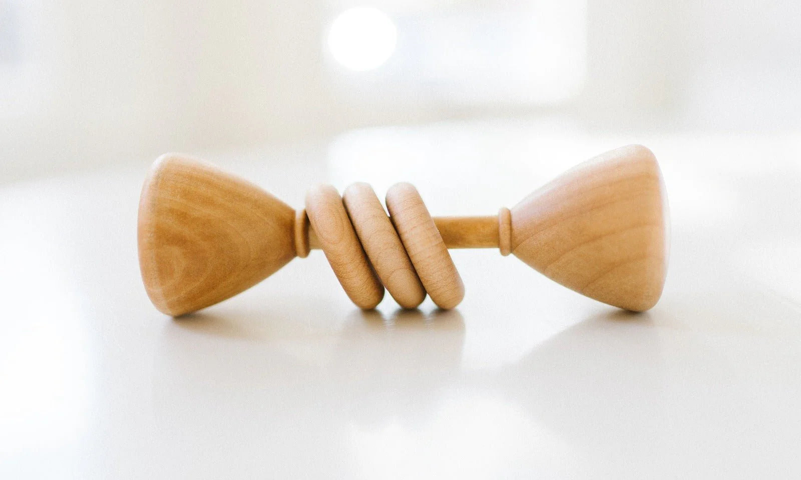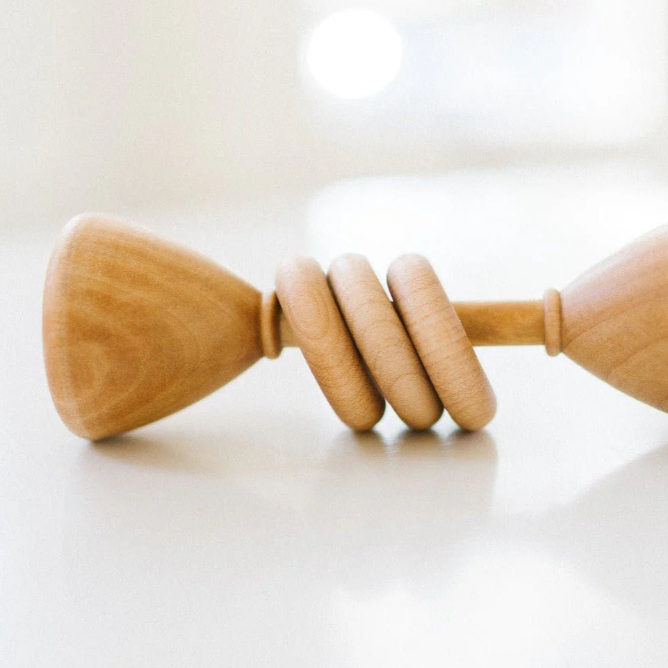This organic wooden baby rattle is safe and durable, made of sustainable maple wood. Beautifully hand crafted, sanded smooth and finished with an organic mix of beeswax and flaxseed oil. The rattle makes a fun noise and helps development of touch, sight, and sound. Perfectly sized for tiny hands to shake and explore with built in grasping spots. The natural woodgrain makes each toy unique, and the feel and scent of the wood brings nature into sensory exploration.