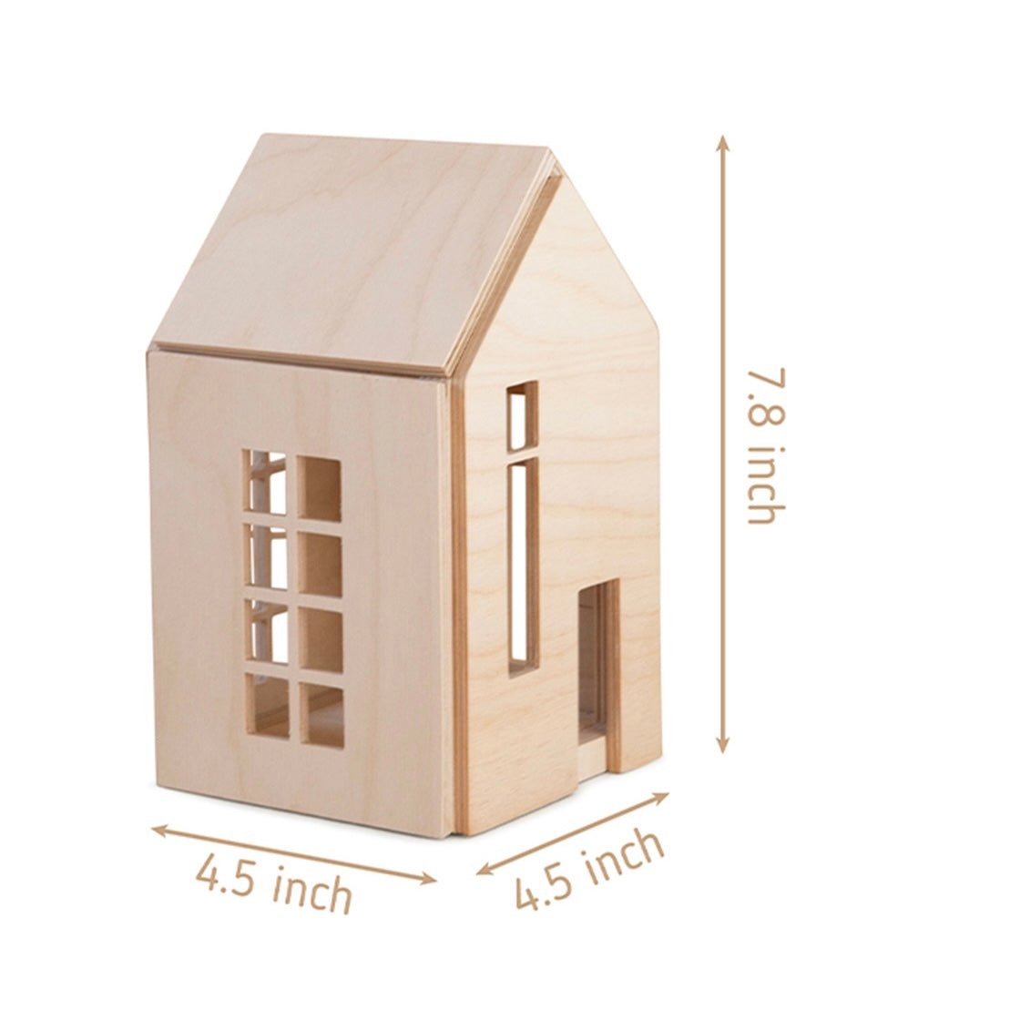 This cozy wooden house for little friends can be disassembled and reassembled whenever you want. A drawstring canvas bag is included for storage and travel. Build a charming house for dolls or toy figures by lining up the magnets on each piece. There is a base, a roof with a skylight, and walls with a front door and windows. The pieces are smooth to the touch and the natural beauty of the wood grain makes each house unique. They are designed for endless creative play.
